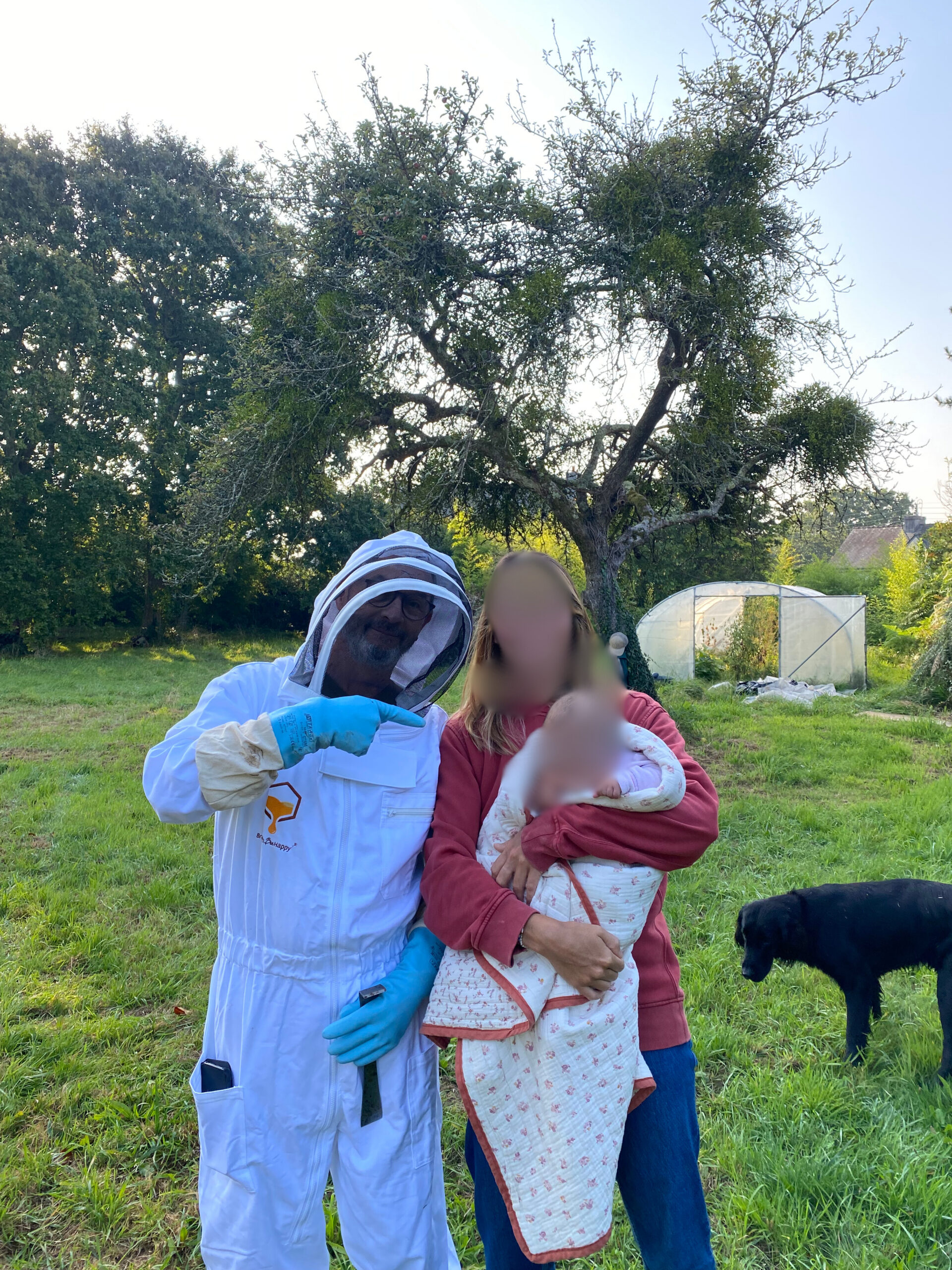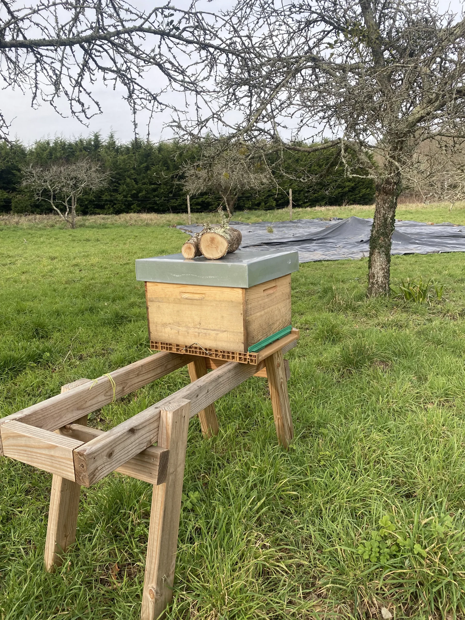 qui entre temps avait mis en place son projet, et avons démarré l’implantation de la ruche non plus chez moi mais dans un havre de paix écologique au milieu d’un verger et d’une prairie maraîchère bio entourées de bois.Une exaltation supplémentaire qui faisait dire à Cyril « oui, elles vont être bien là ». La ruche est mise en place en septembre 2024 et, à évoluer au milieu de la nuée en combinaison d’apiculteur, il me vient un sentiment de responsabilité; me voilà père de famille nombreuse.